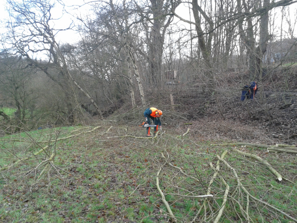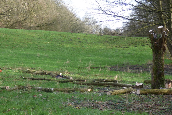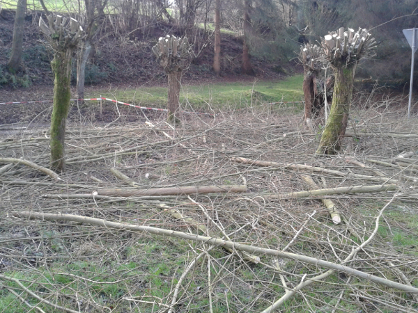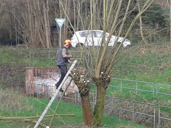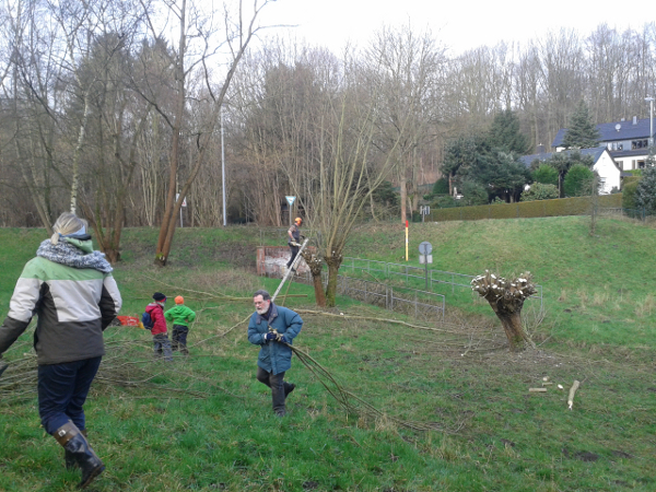 Der Presseaufruf zur Suche von Helfer*innen war dieses Jahr endlich einmal ein voller Erfolg. Es meldeten sich 8 Personen, darunter 3 mit Motorsägenschein und eigener Motorsäge. Das Wetter spielte auch mit. So konnten am Samstag (06.02.16) insgesamt 22 Kopfweiden geschnitten werden. 12 Personen waren im Einsatz, einschließlich der Kinderbetreuung. 7 Kinder aus der AkU-Kindergruppe halfen ebenfalls die Äste zum Todholzhaufen zusammenzutragen. Die Äste mussten aus dem Regenrückhaltebecken entfernt werden um eine Verstopfung der Durchlässe zu vermeiden. Die meisten Äste wurden im Schatten alter Bäume aufgeschichtet um ein Anwachsen zu verhindern. Ein Teil wurde für einen Weidenzaun im Garten mitgenommen. Die dickeren wärmen nach dem Trocknen eine Wohnung. Nach 3,5 Stunden – einschließlich einer Kaffeepause mit belegten Brötchen – verließen die letzten Aktiven den Ort des Geschehens. Nächstes Jahr schneiden wir an einem Samstag im Januar oder Februar an einer anderen Stelle wieder Kopfweiden.