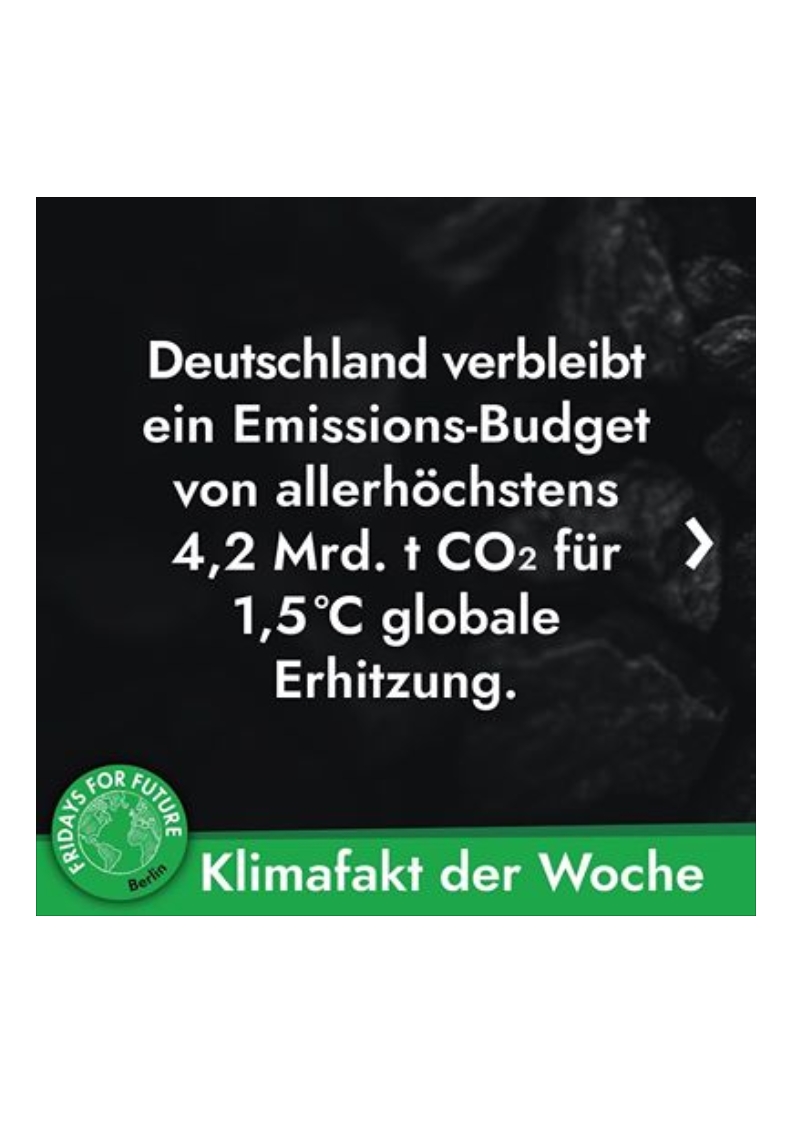 Bei einem jährlichen CO2-Ausstoß von 866 Mio. t CO2 (Stand 2018) [2] wird Deutschland schon 2024 das Budget für 1,5°C sprengen – und 2028 das Budget für 1,75°C. Um überhaupt noch eine Chance zu haben, das Pariser Klimaschutzabkommen nicht völlig zu verfehlen, muss Deutschland seine Emissionen in den nächsten Jahren drastisch reduzieren!